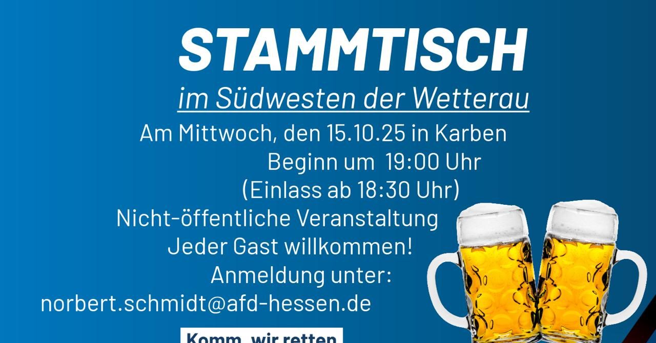 Liebe Freunde, Unterstützer und Interessierte, wir laden Sie herzlich zu unserem nächsten Stammtisch im Südwesten der Wetterau ein!Nutzen Sie die Gelegenheit, in gemütlicher Atmosphäre miteinander ins Gespräch zu kommen, Fragen zu stellen und sich über aktuelle Themen auszutauschen. 📅 Mittwoch, 15. Oktober 2025📍 in Karben🕖 Beginn: 19:00 Uhr (Einlass ab 18:30 Uhr) Die Veranstaltung ist […]