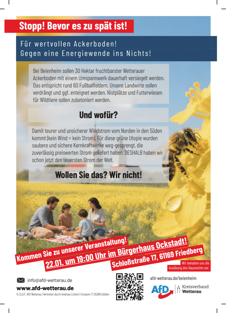 Wir laden Sie herzlich ein, sich aus erster Hand zu informieren und Ihre Meinung einzubringen. Bei unserer Veranstaltung beleuchten wir die Planungen, die Folgen für Beienheim und die Wetterau – und diskutieren gemeinsam Alternativen.
